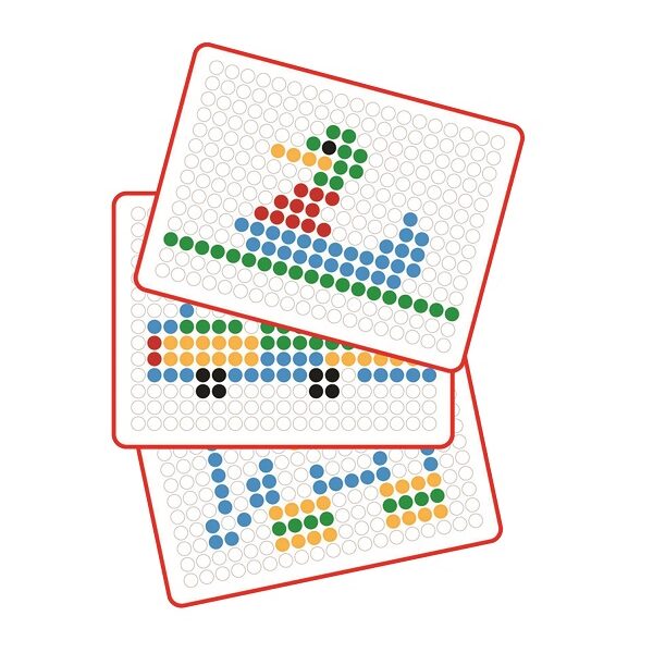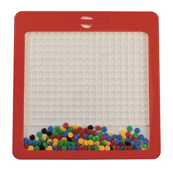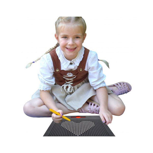 Pizarra plástica con un lápiz magnético que se utiliza para mover puntitos de colores dentro de la pizarra, formando diversas y creativas composiciones. Incluye 10 plantillas con distintos diseños sugeridos.
