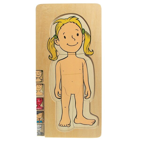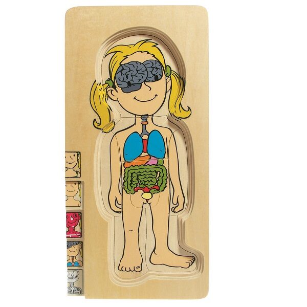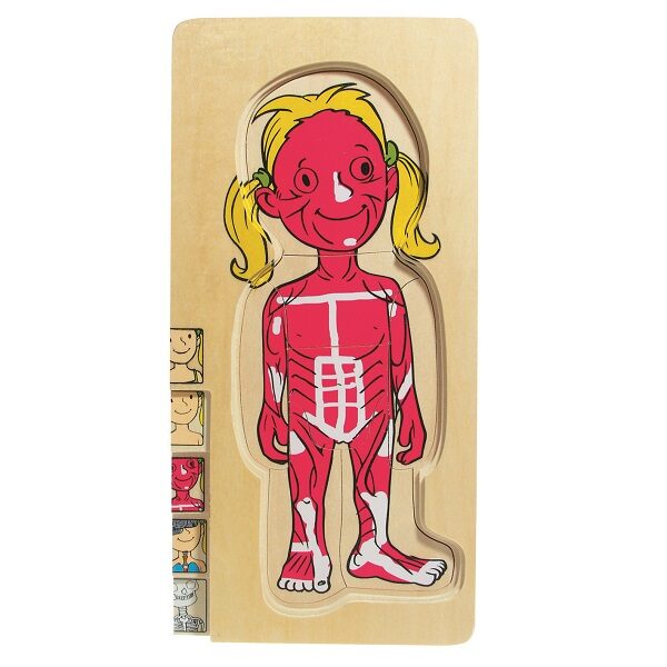 Puzle de 5 capas (36 piezas) que ilustra la anatomía del cuerpohumano, desde el esqueleto hasta la capa más externa de la niña con ropa.
